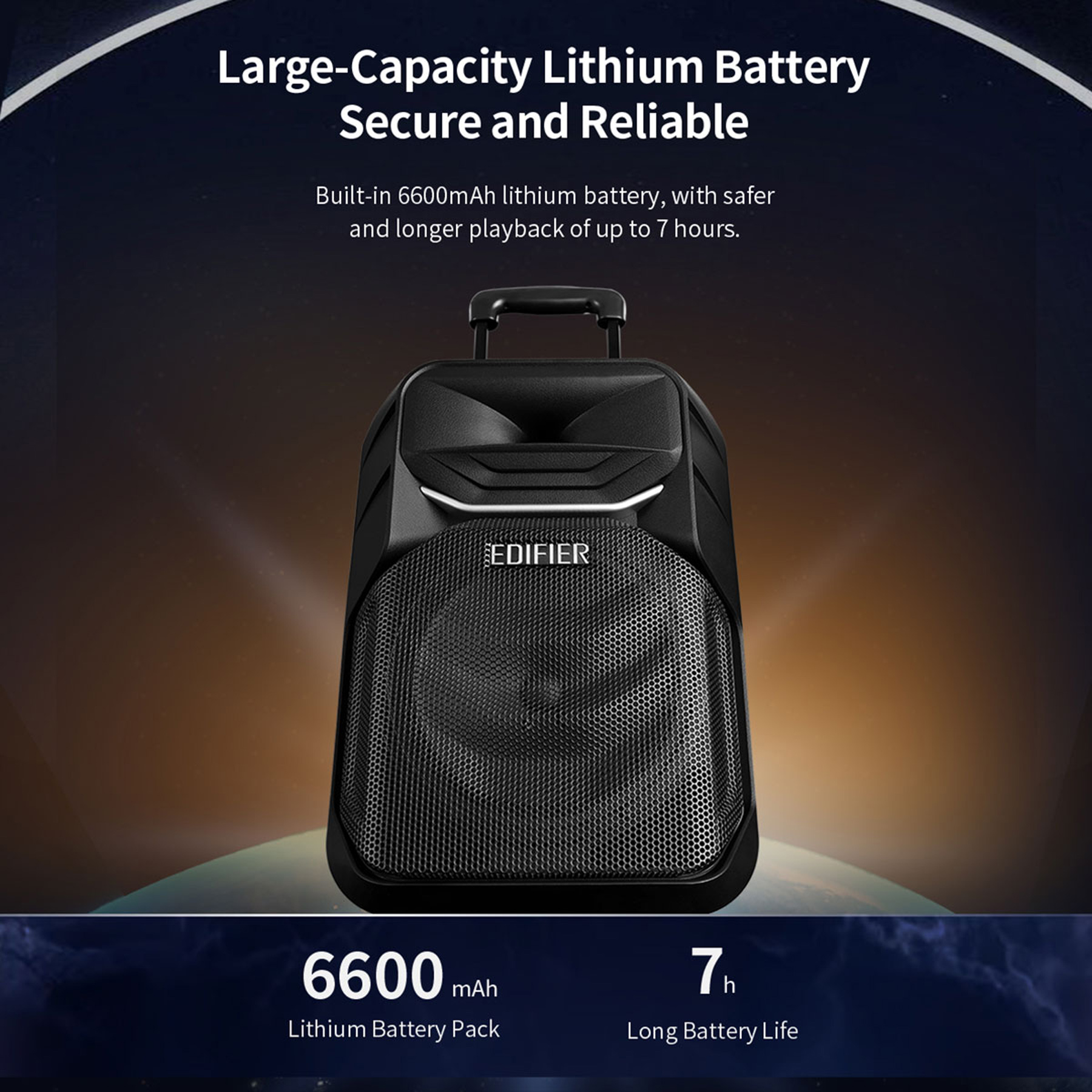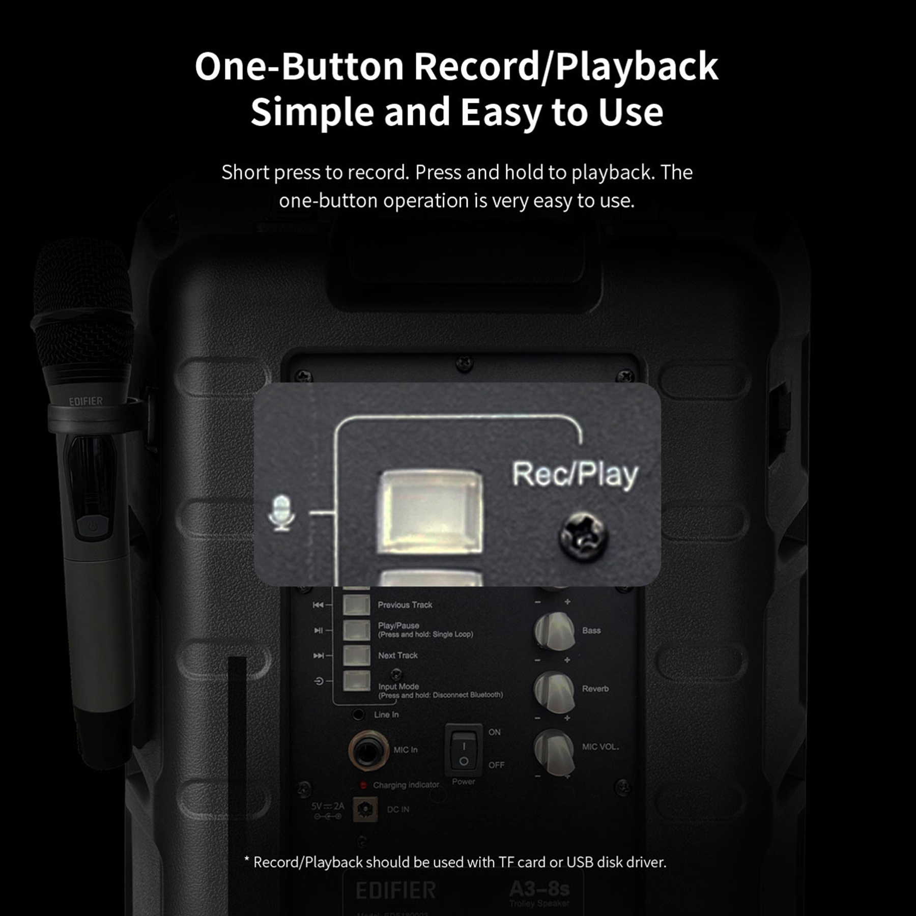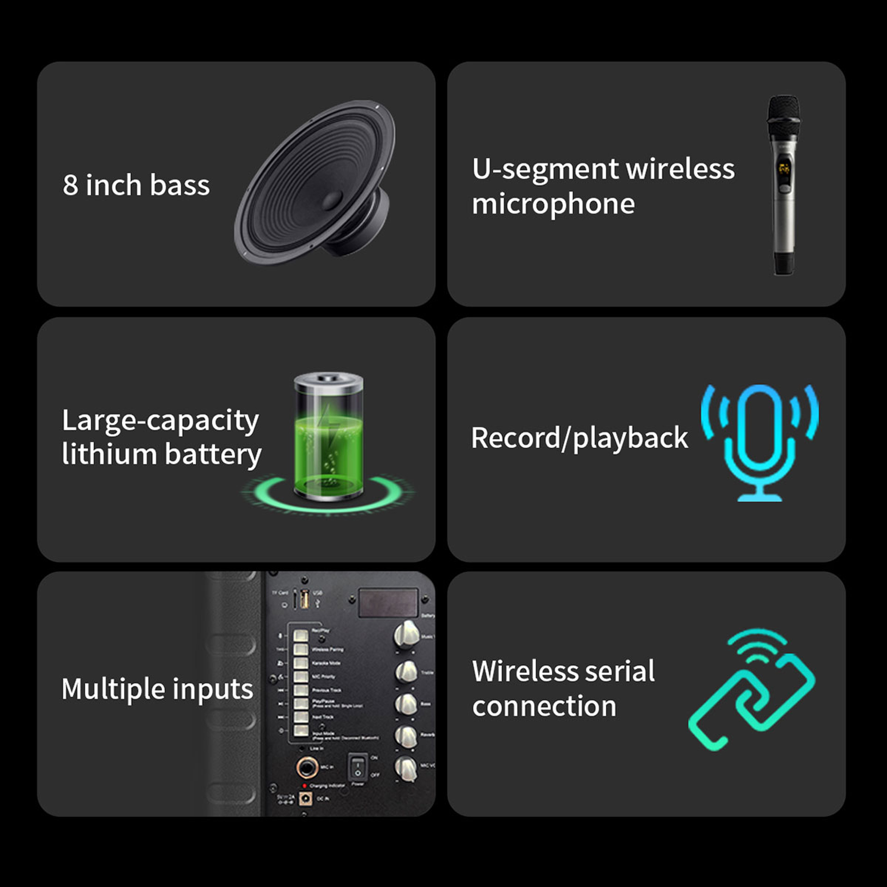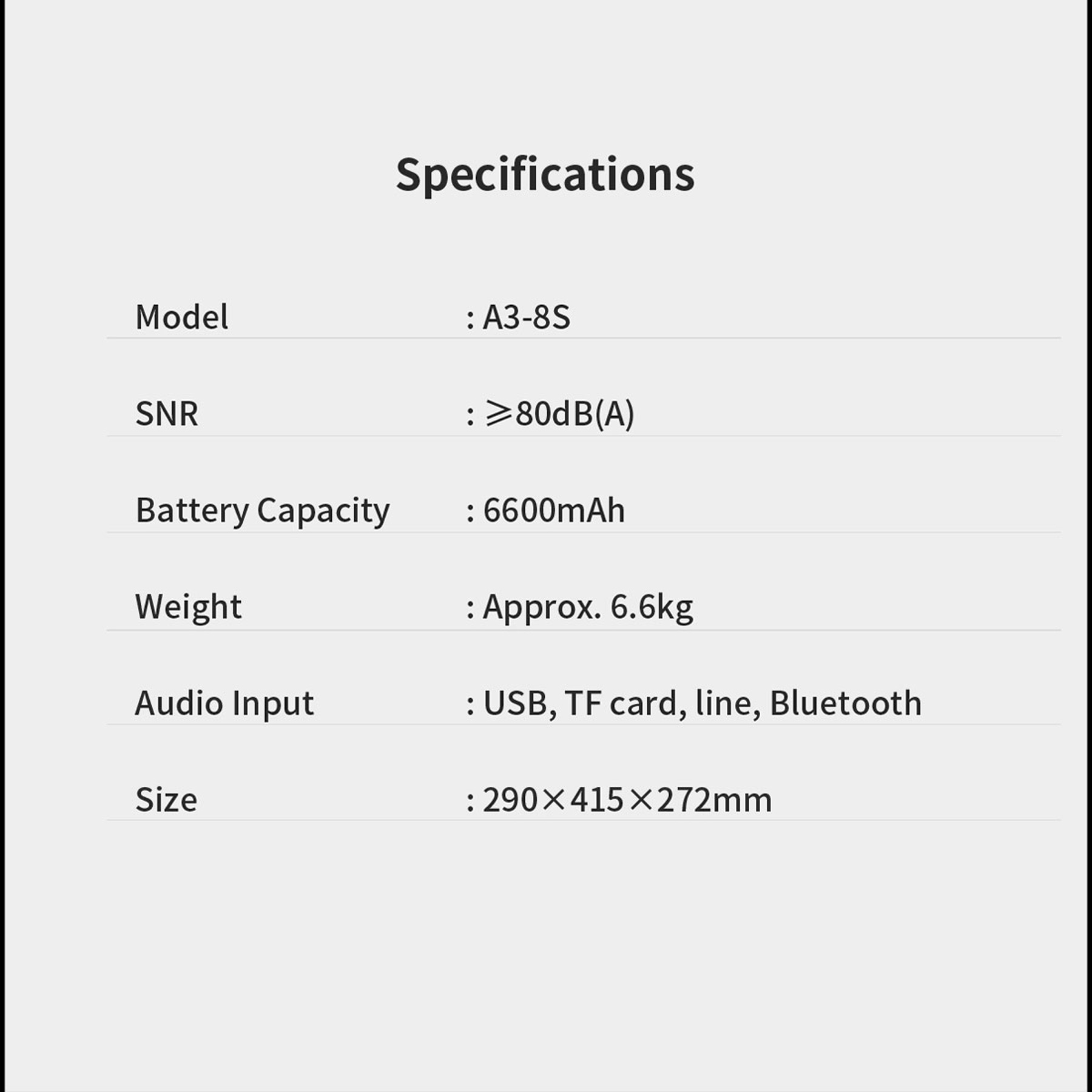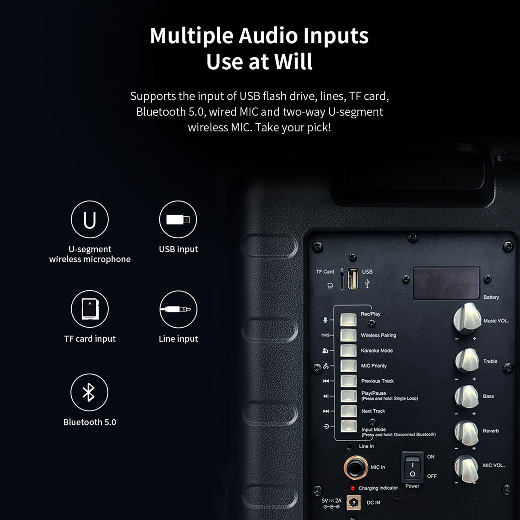 Multiple inputs include Bluetooth, AUX line in, microphone in, TF card and USB input