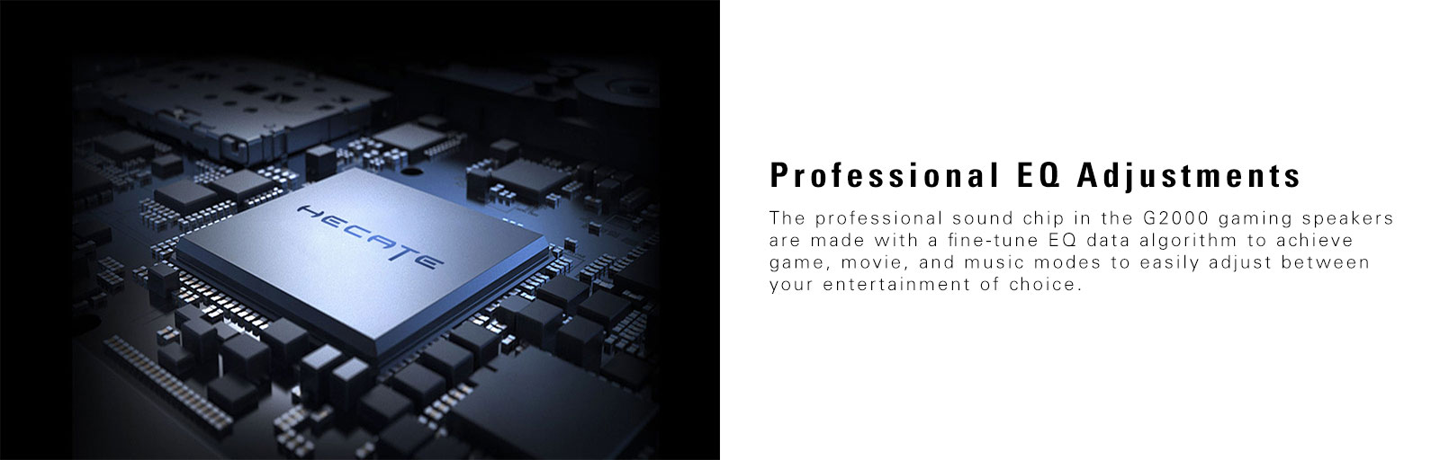 The professional sound chip in the G2000 gaming speakers are made with a fine-tune EQ data algorithm to achieve game, movie, and music modes to easily adjust between your entertainment of choice.