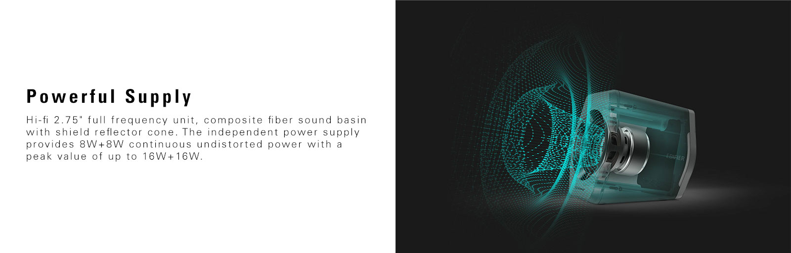 Hi-fi 2.75″ full frequency unit, composite fiber sound basin with shield reflector cone. The independent power supply provides 8W+8W continuous undistorted power with a peak value of up to 16W+16W.