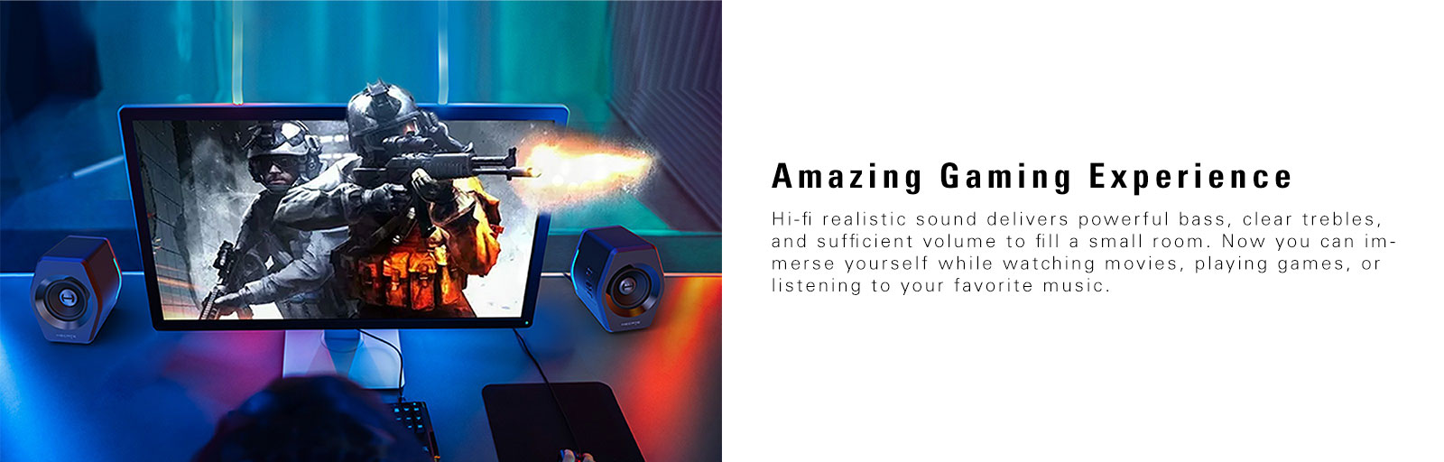 Hi-fi realistic sound delivers powerful bass, clear trebles, and sufficient volume to fill a small room. Now you can immerse yourself while watching movies, playing games, or listening to your favorite music.