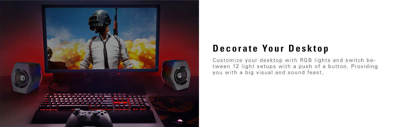 Customize your desktop with RGB lights and switch between 12 light setups with a push of a button. Providing you with a big visual and sound feast.