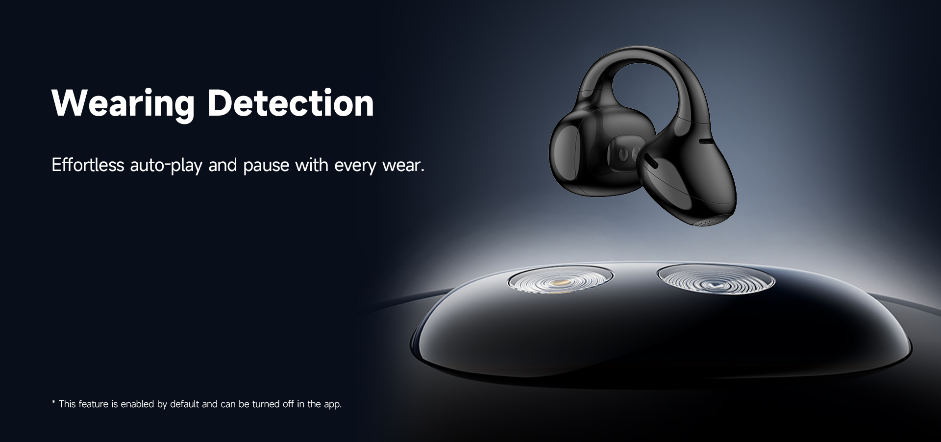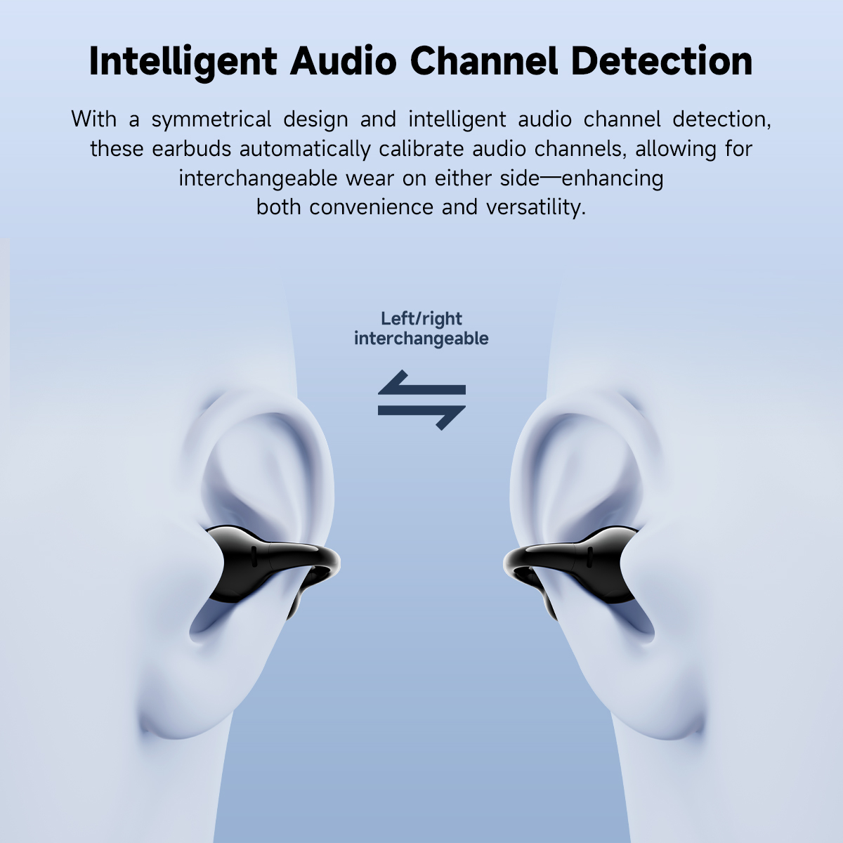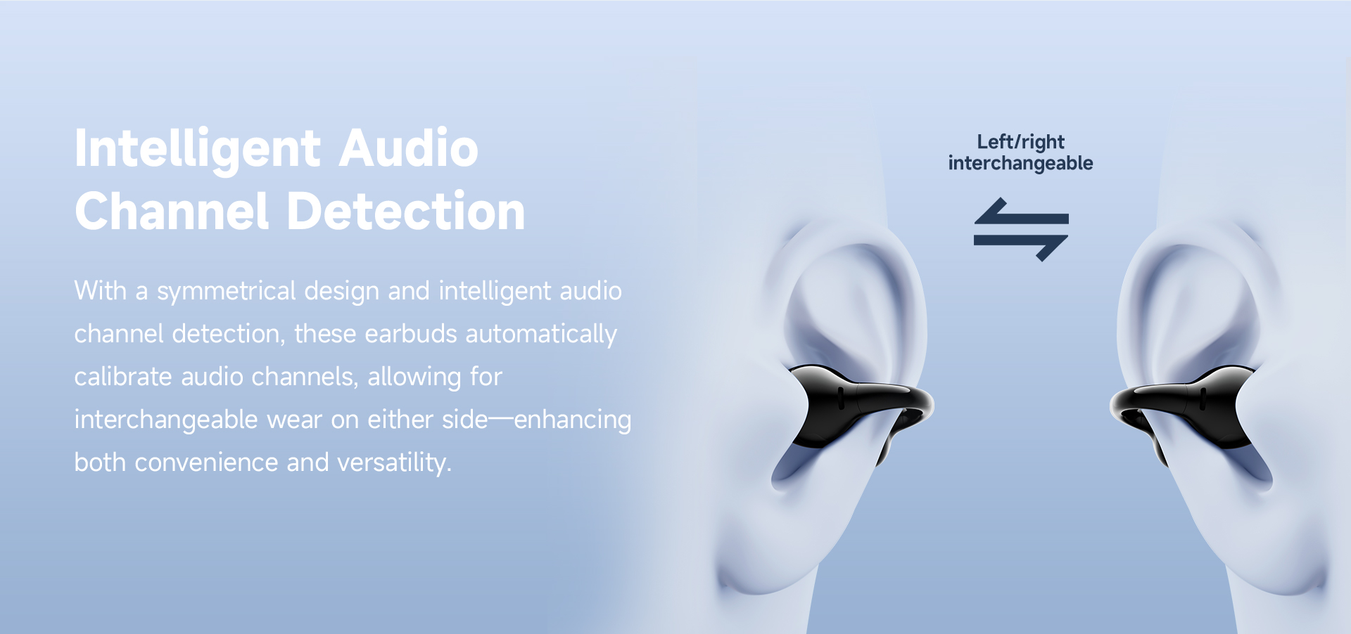 Intelligent audio channel detection enables interchangeable wear on either side.