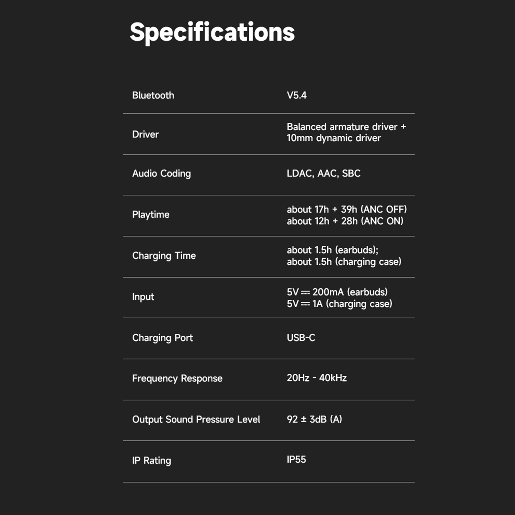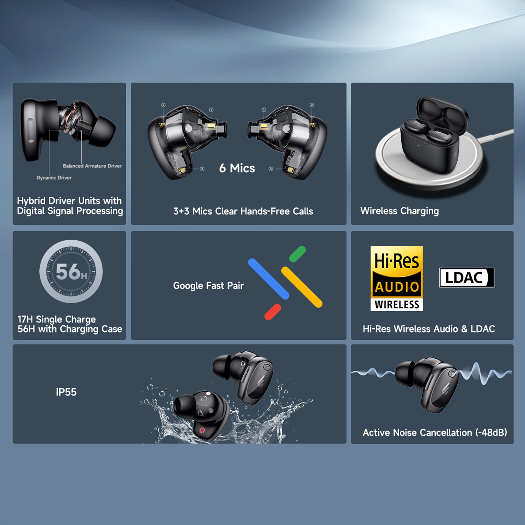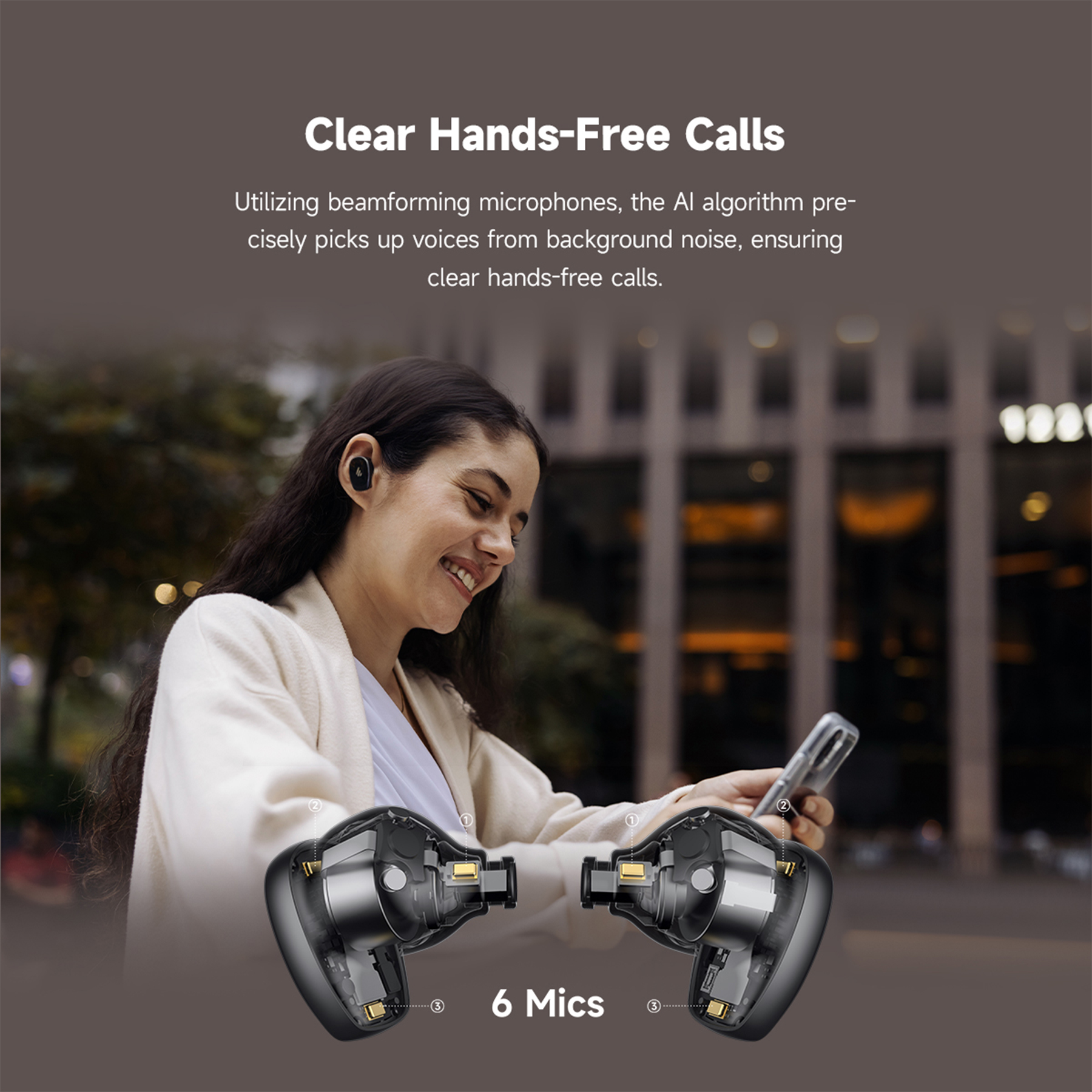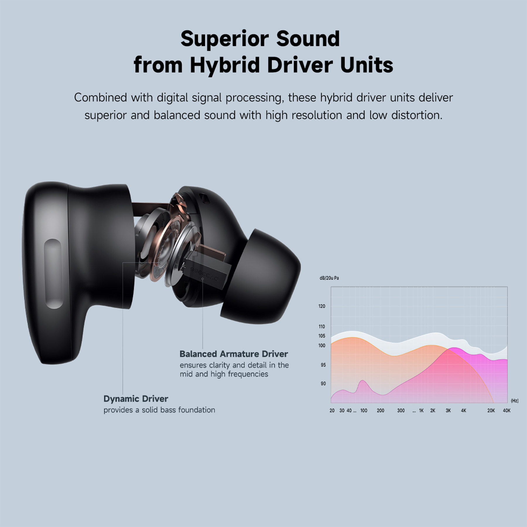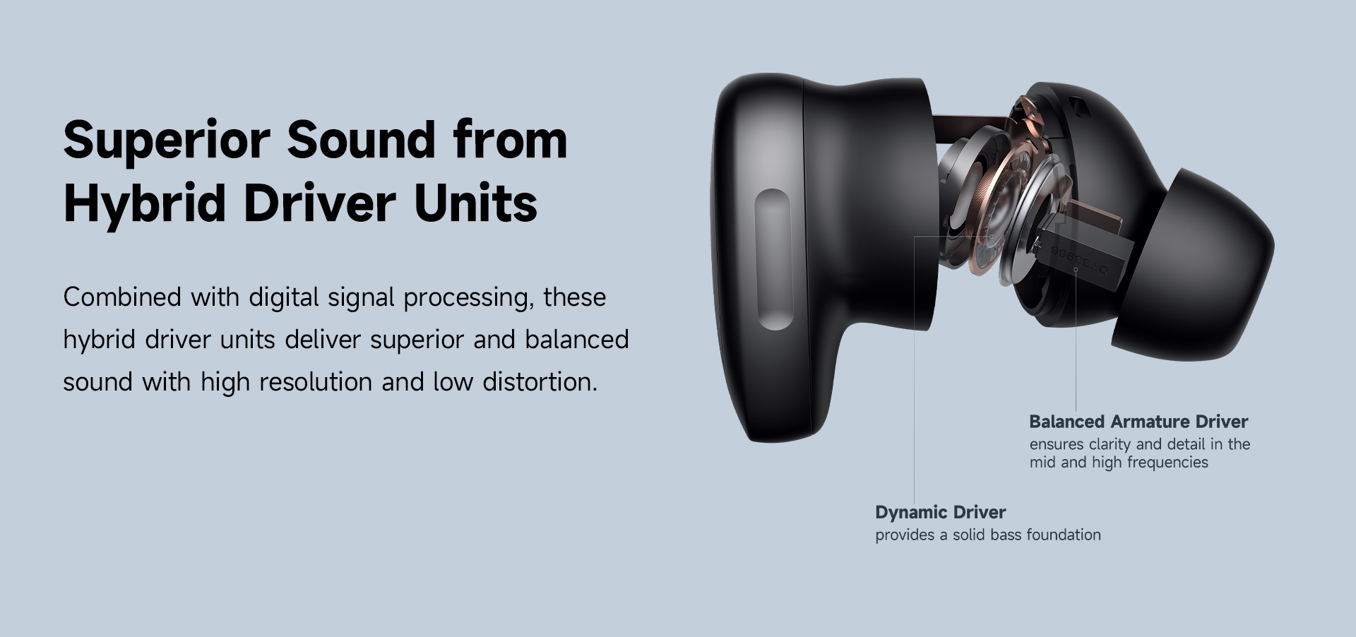 Hybrid driver units (BA and 10mm dynamic drivers), combined with digital signal processing and active crossover, deliver superior sound quality.
