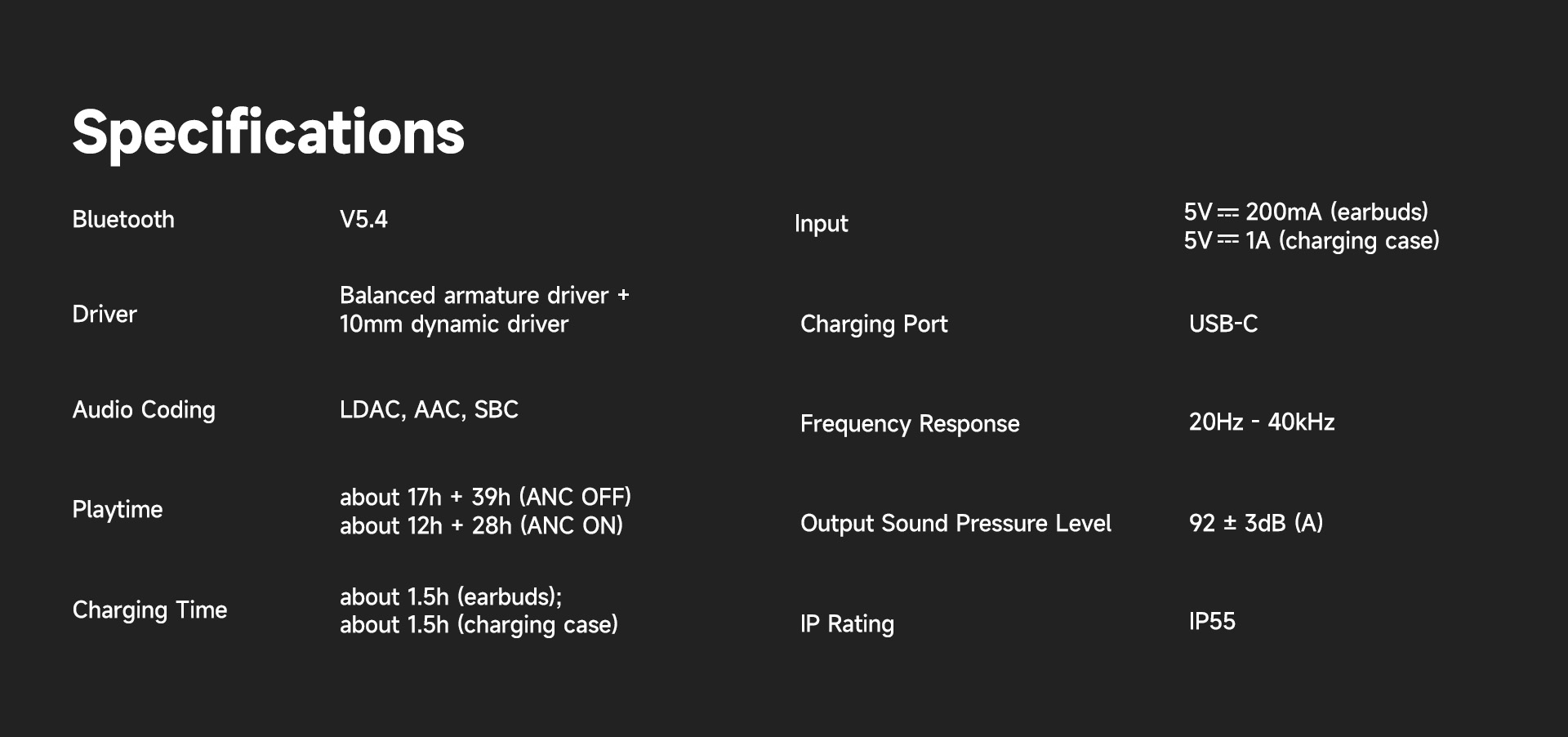 Battery life lasts up to 56 hours with the charging case, and fast charging is available—15 minutes of charging provides 5 hours of playback.