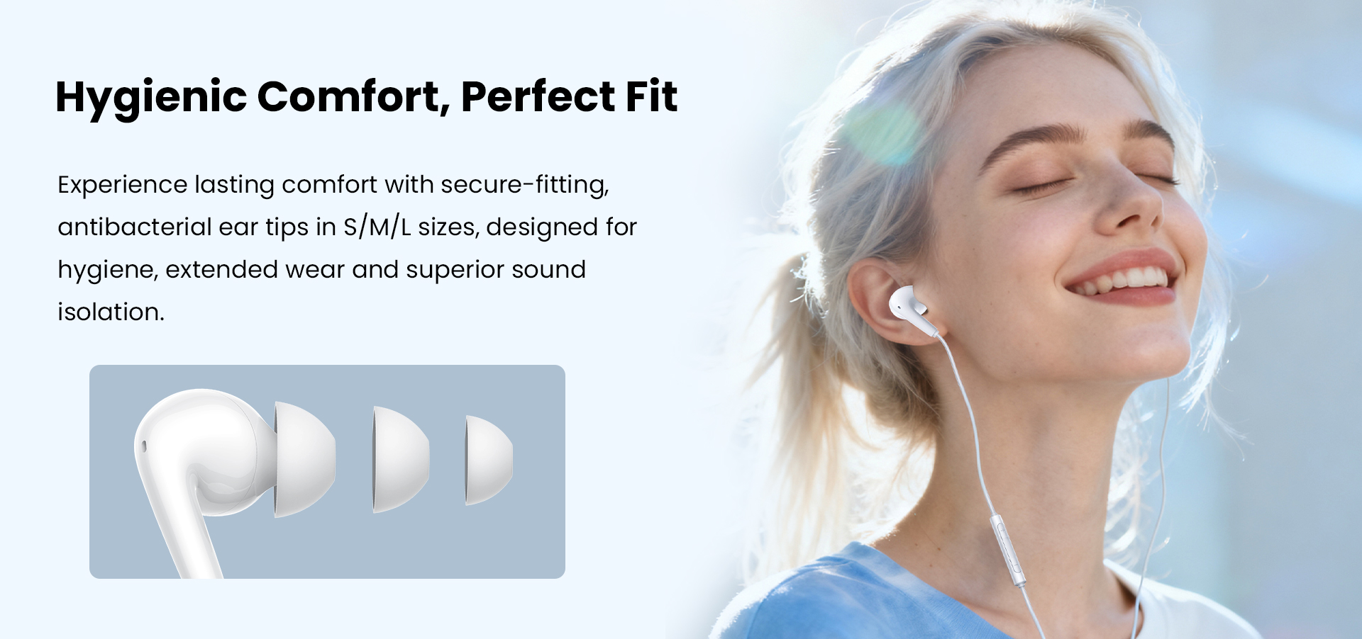 Antibacterial ear tips in three sizes provide lasting comfort and a secure fit.