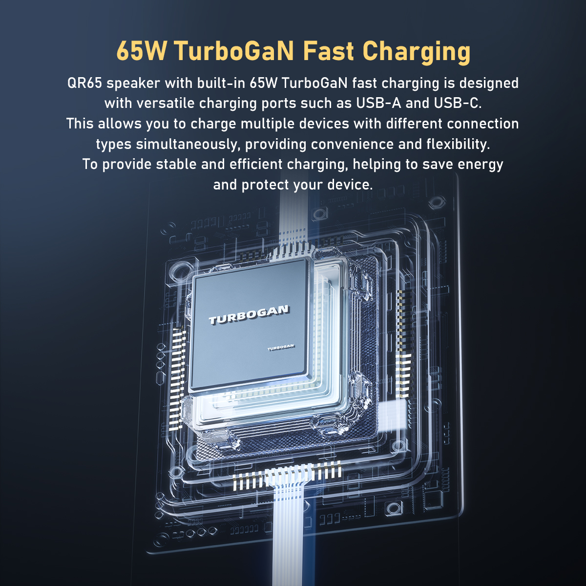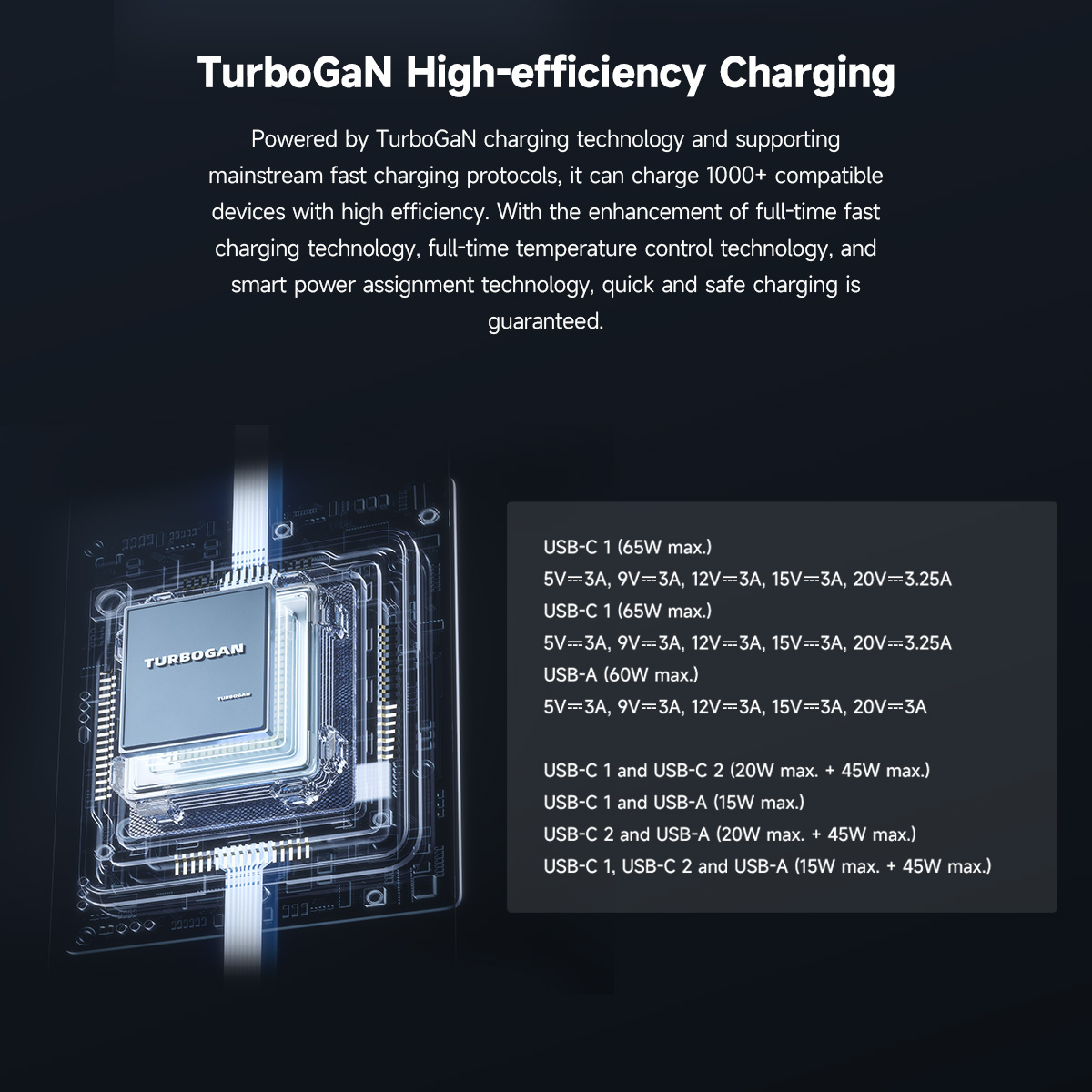 65W TurboGaN fast charging via two USB Type-C ports and one USB Type-A port