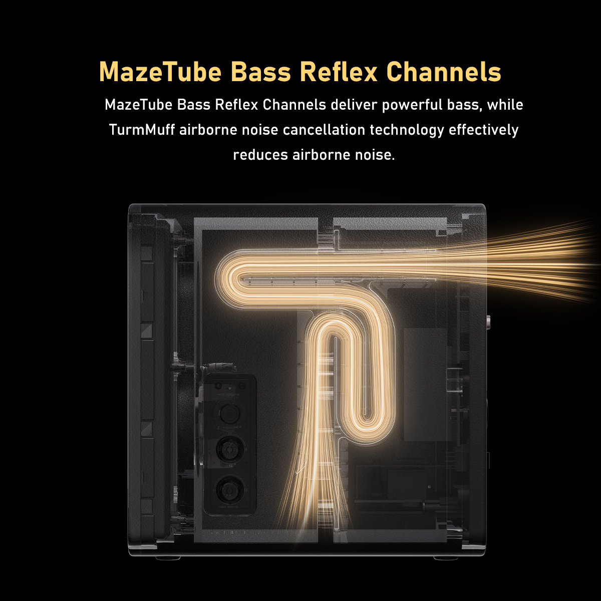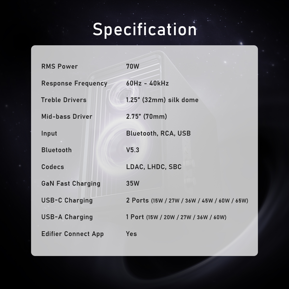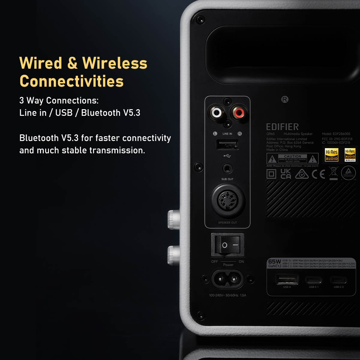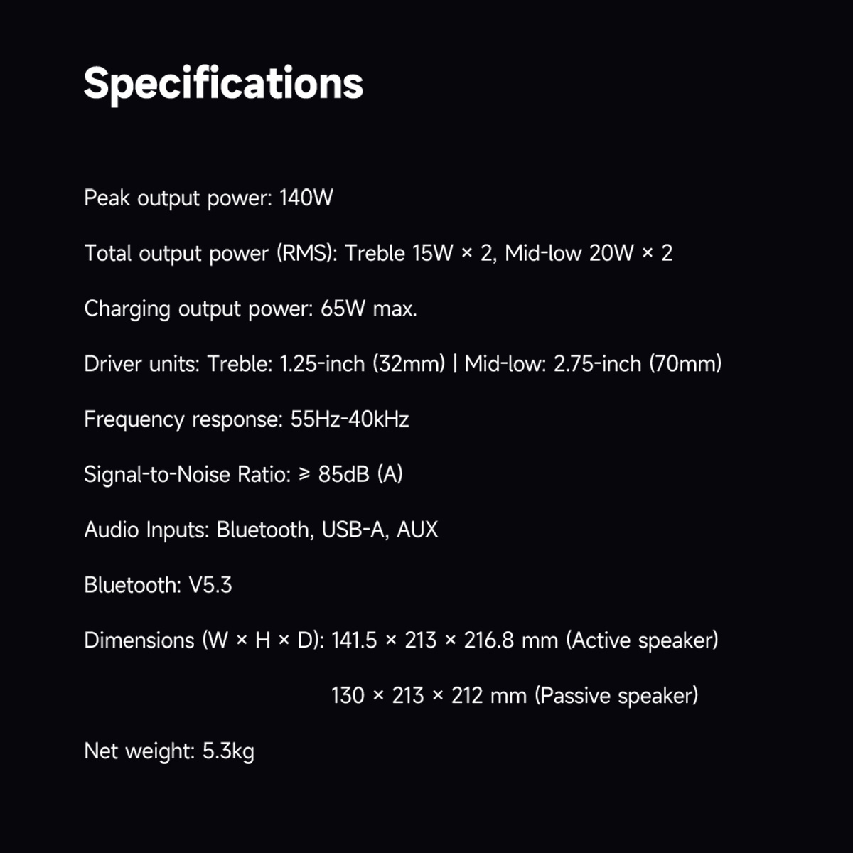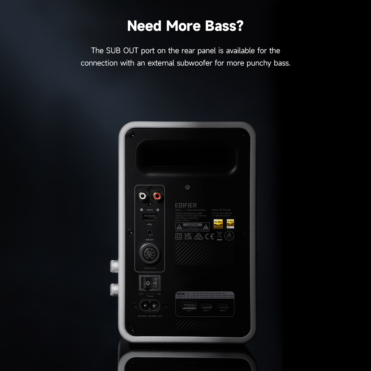 Bluetooth V5.3, USB and LINE IN inputs; subwoofer output port available
