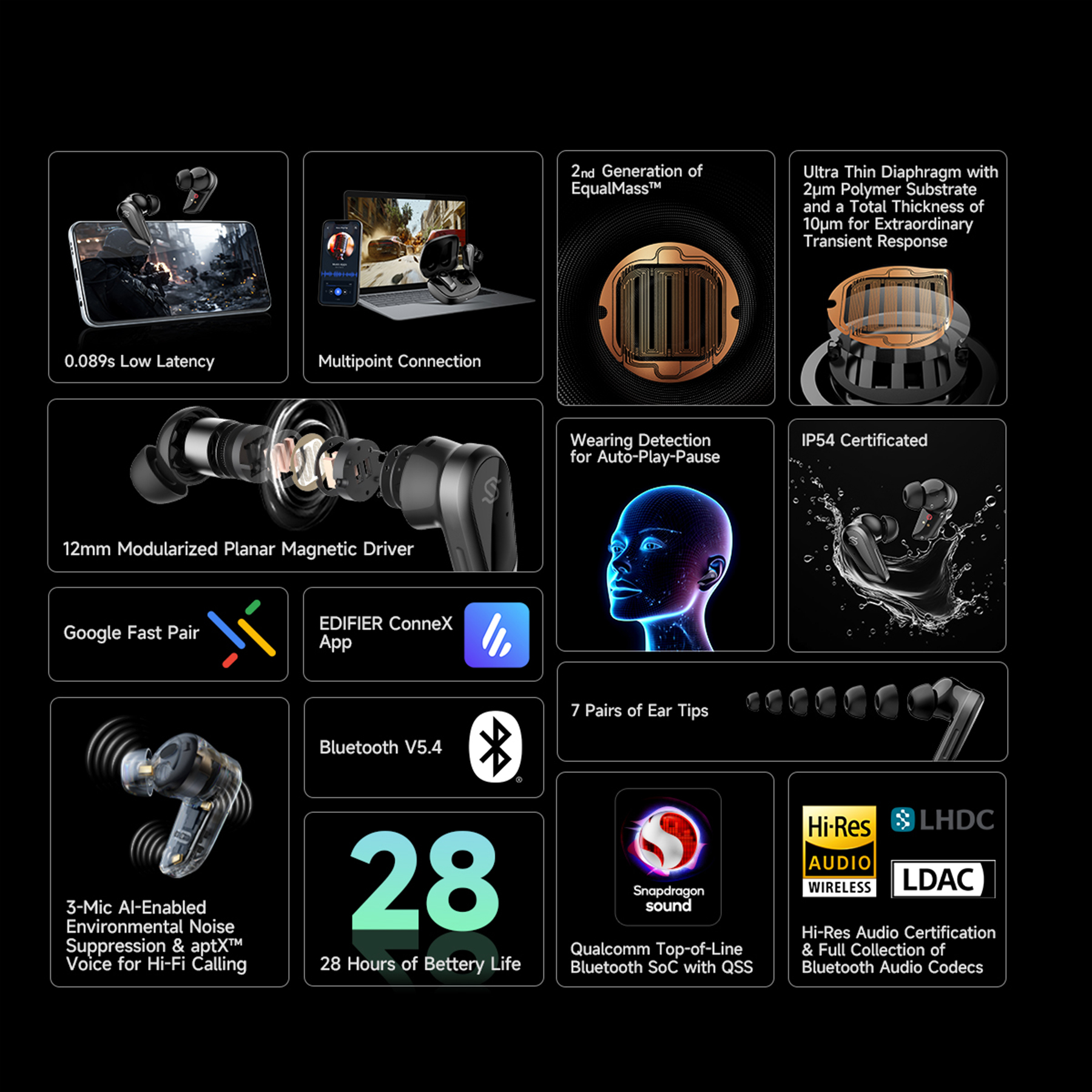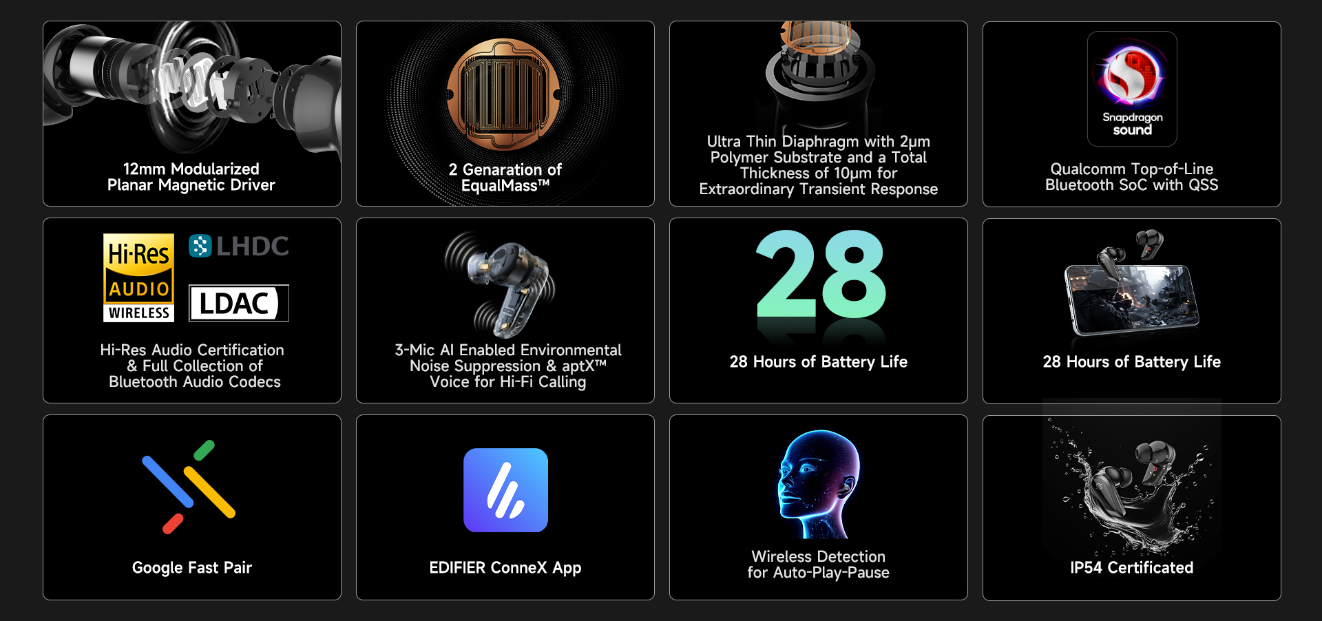 EDIFIER patented 2nd generation EqualMass™ wiring technology for steady piston-motion planar driver performance.