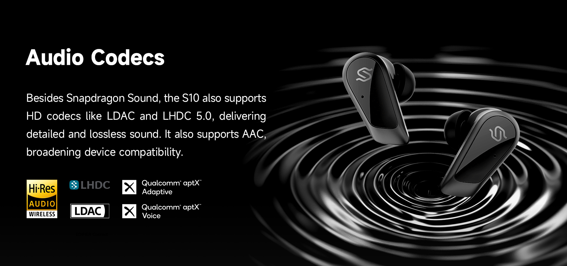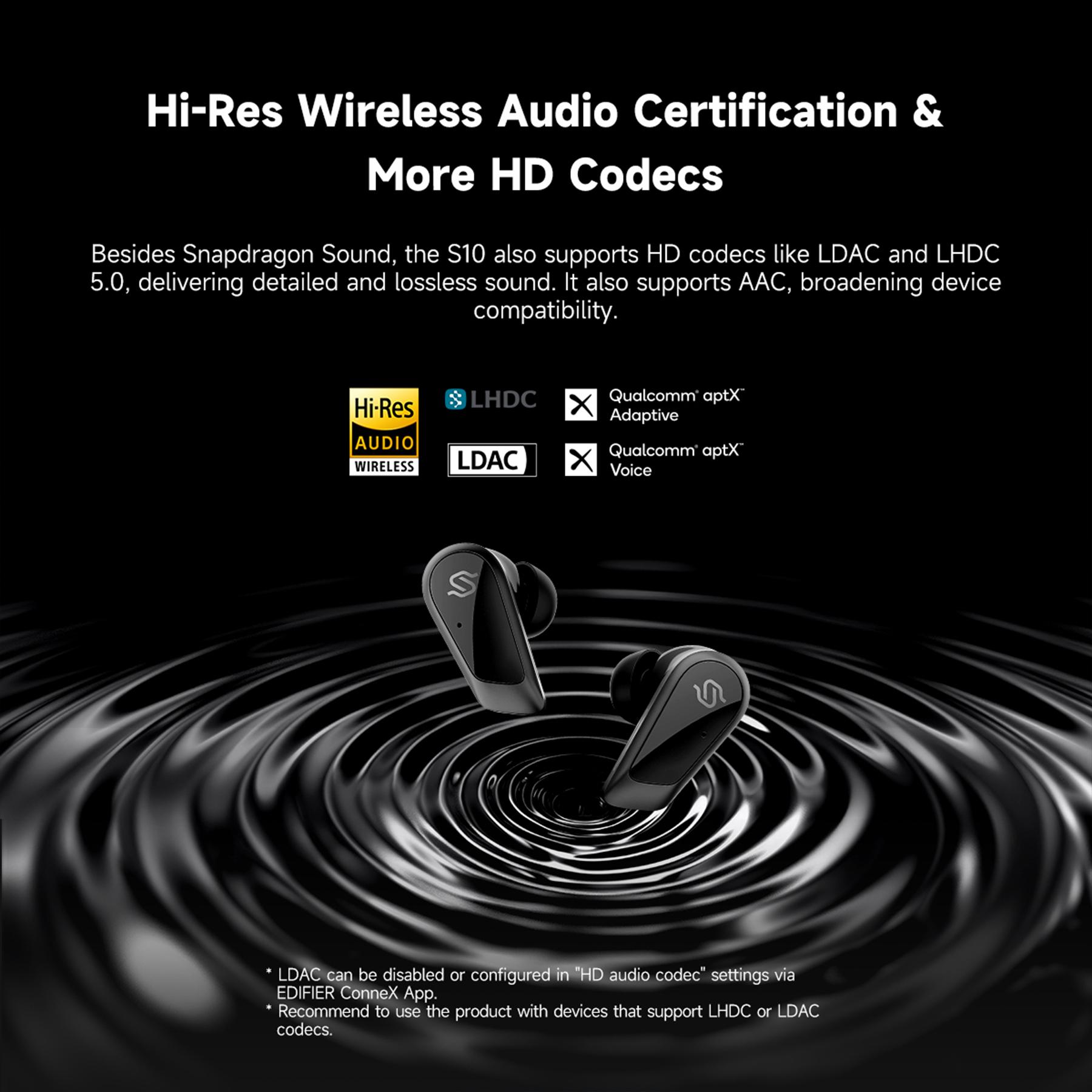 Hi-Res Wireless Audio certification & HD codecs, ensuring superior sound quality and versatile compatibility.