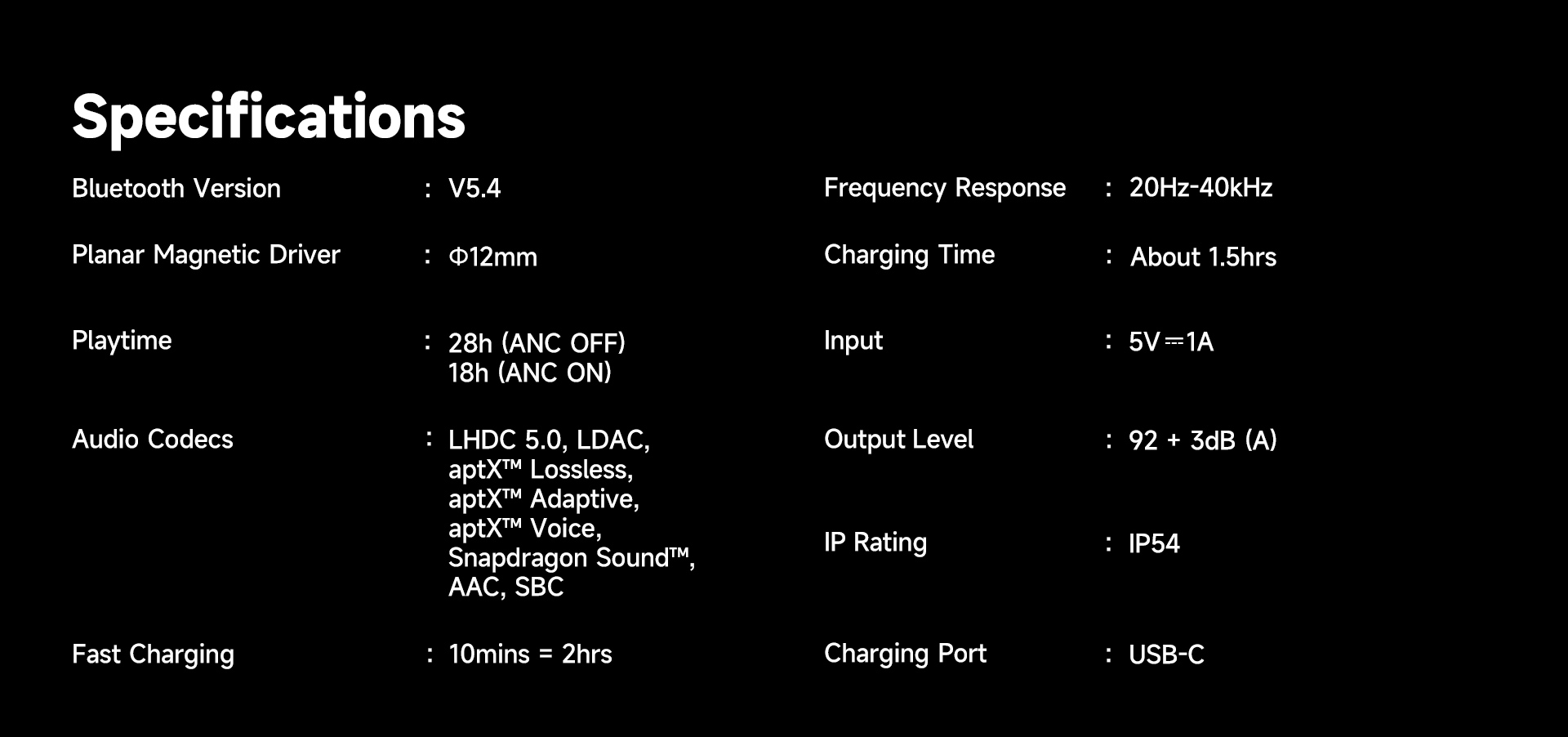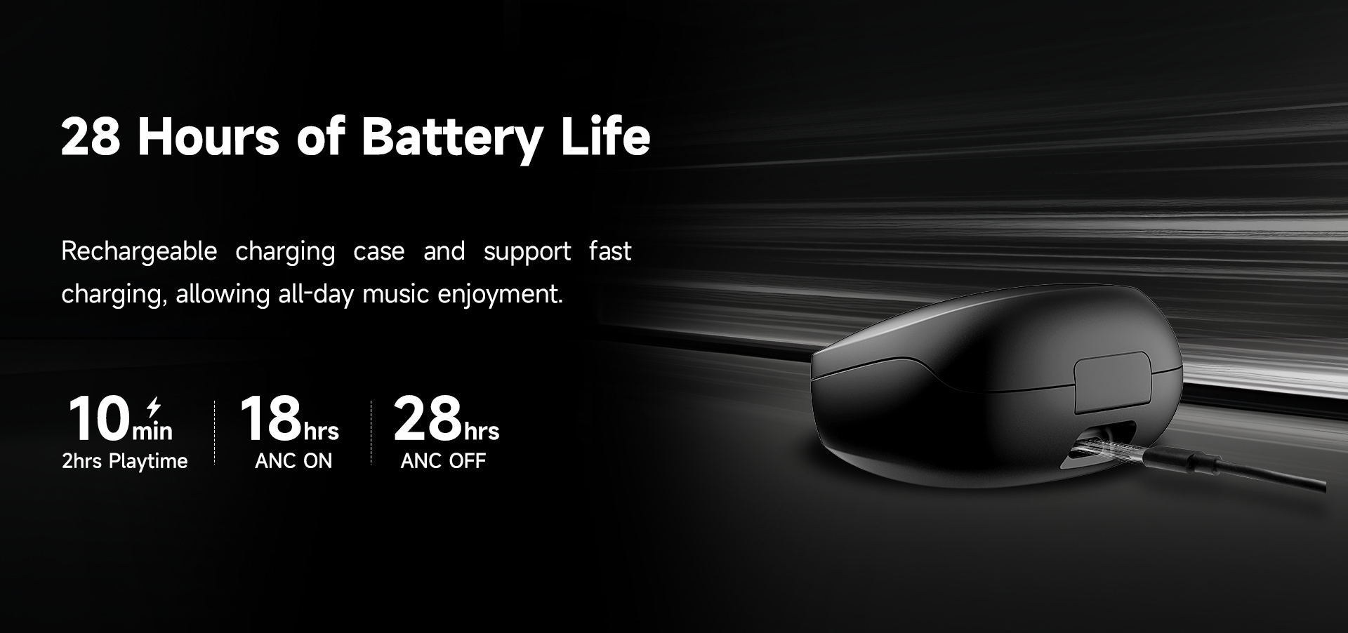 Battery life up to 28 hours (ANC OFF with charging case), and is fast charging available. 15 mins charging for 2 hours playback.