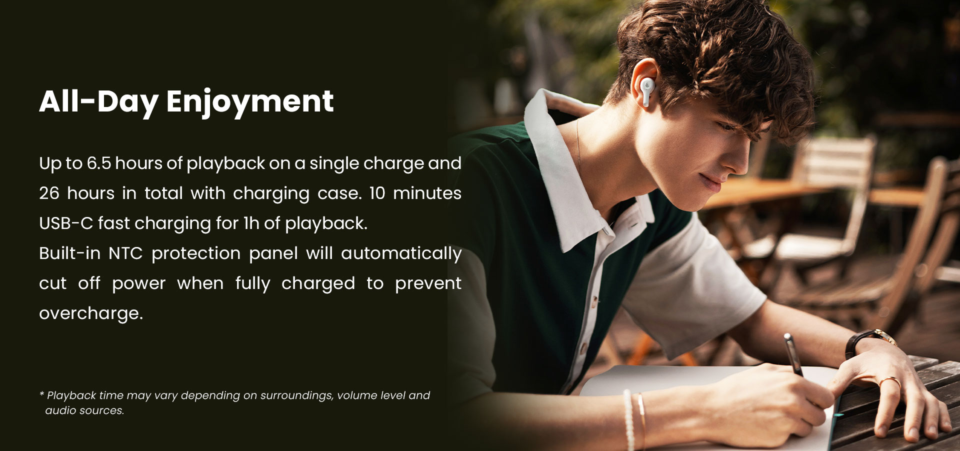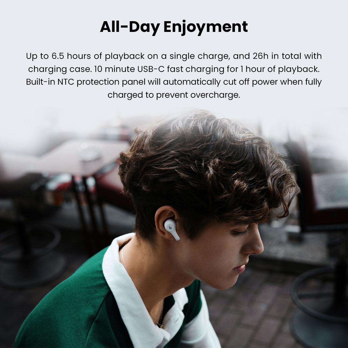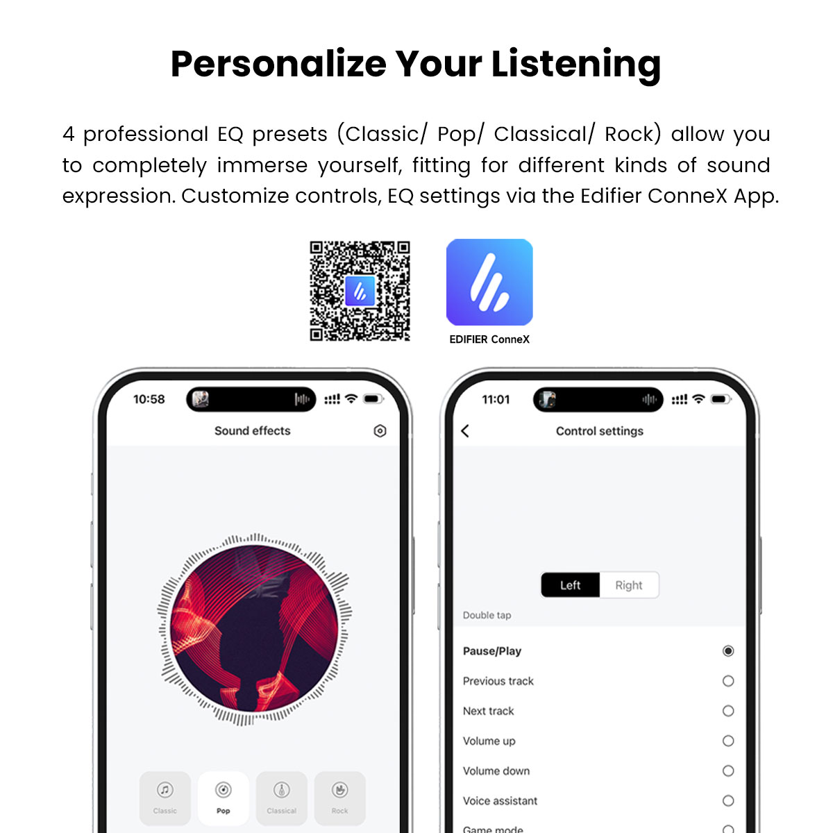 Fine-tuned 6mm drivers deliver powerful bass and 4 EQ presets (Classic/Pop/Classical/Rock) via Edifier Connect App