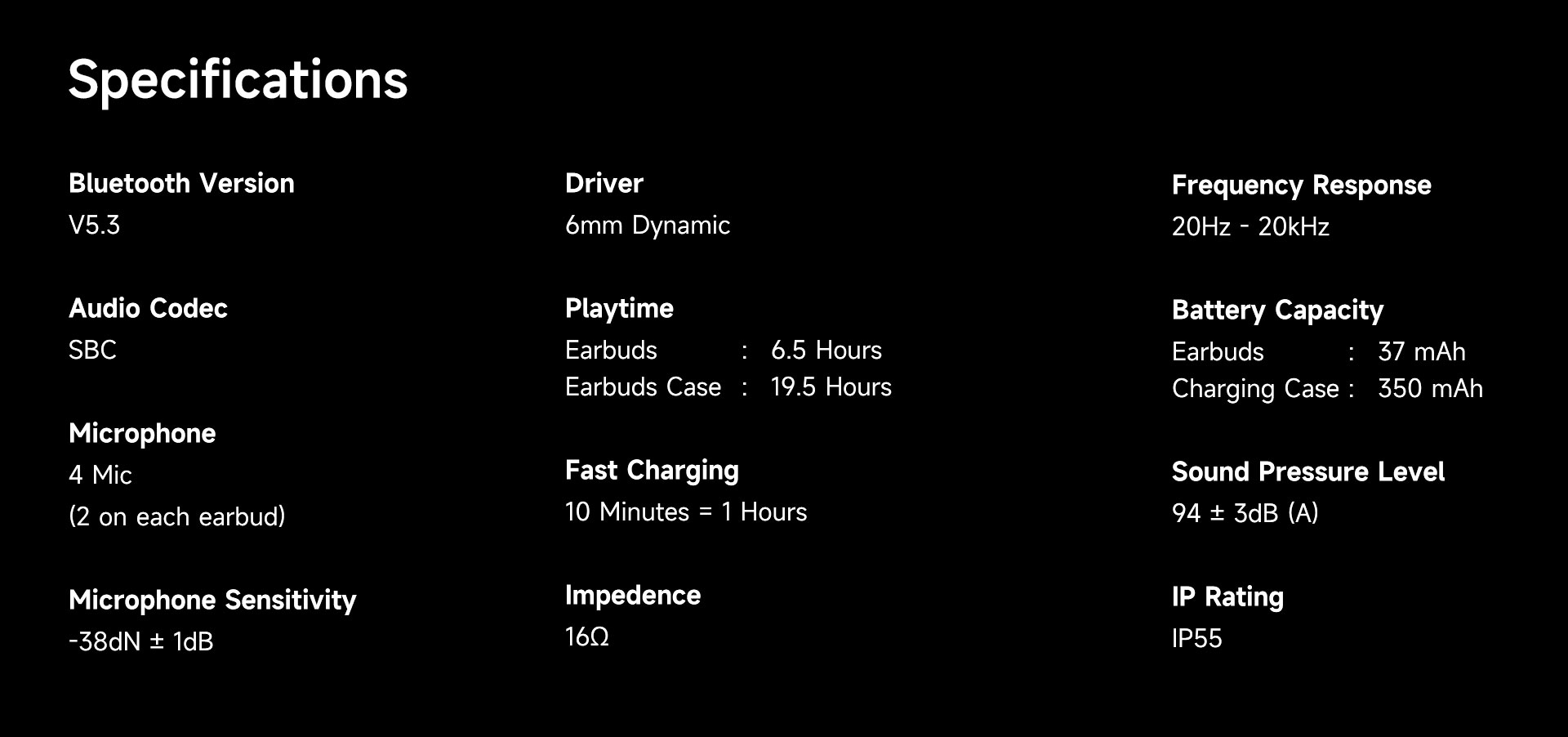 Earbuds provide about 6.5 hours of music playback and charging case provides an additional 19.5 hours of battery life